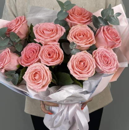 Буукет 11 розовых роз с эвкалиптом | Купить с доставкой в Одинцово