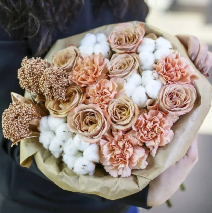 Потрясающий букетик в кофейных тонах из роз, диантусов и хлопка с добавлением окрашенного озотамнуса