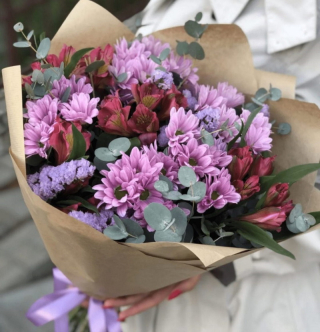 Удивительный букет из нежных альстромерий и роз в стильной упаковке.