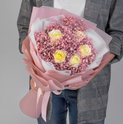 Букет "Нежные объятия" с крашенной гипсофилой и розой в Одинцово