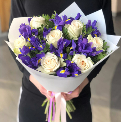 Букет с ирисами и белыми розами | Купить в Одинцово