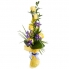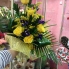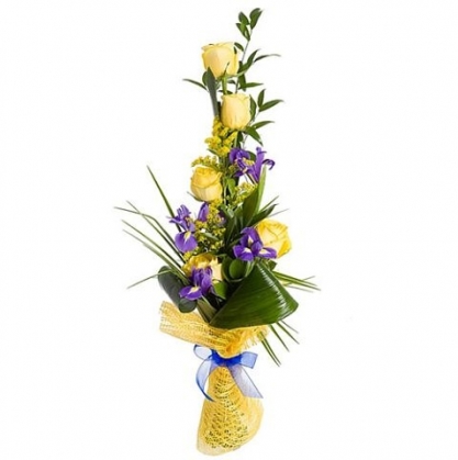 Состав букета: 5 желтых роз, 6 ирисов, рускус, солидаго, робеллини, листья аспедистры, упаковка.