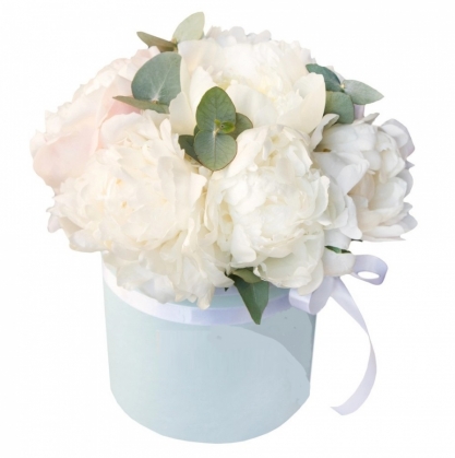 Купить белые пионы в шляпной коробке с доставкой в Одинцово