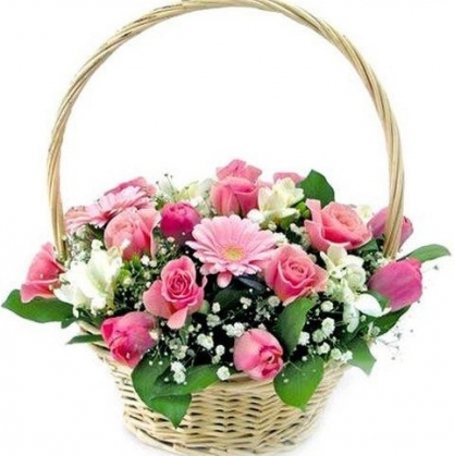 Удивительно нежная корзинка из богатого состава цветов отлично подходит в подарок на День Рождения.