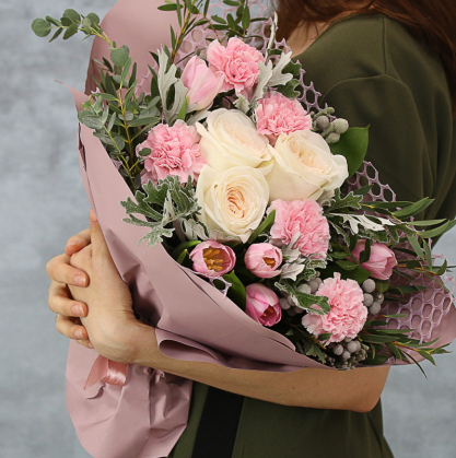 Букет, состоящий из роз, гвоздик и тюльпанов, дополненный брунией, листьями питтоспорума и эвкалипта, будет иметь невероятно красивый и роскошный вид. Розы своими богатыми и крупными бутонами создадут насыщенный контраст с изящными и изысканными гвоздиками, а яркие и красочные тюльпаны добавят нотку свежести и яркости. Добавление брунии и листьев питтоспорума даст букету дополнительное динамичности и сочности, а эвкалипт добавит еще одну ноту зелени и натурализма. В целом, этот букет будет иметь эффектный и красочный вид, который делает его идеальным выбором.