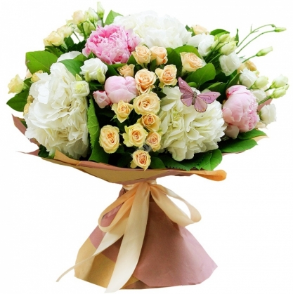Очаровательная композиция из пионов, кустовых роз, эустомы, гортензии с добавлением зелени